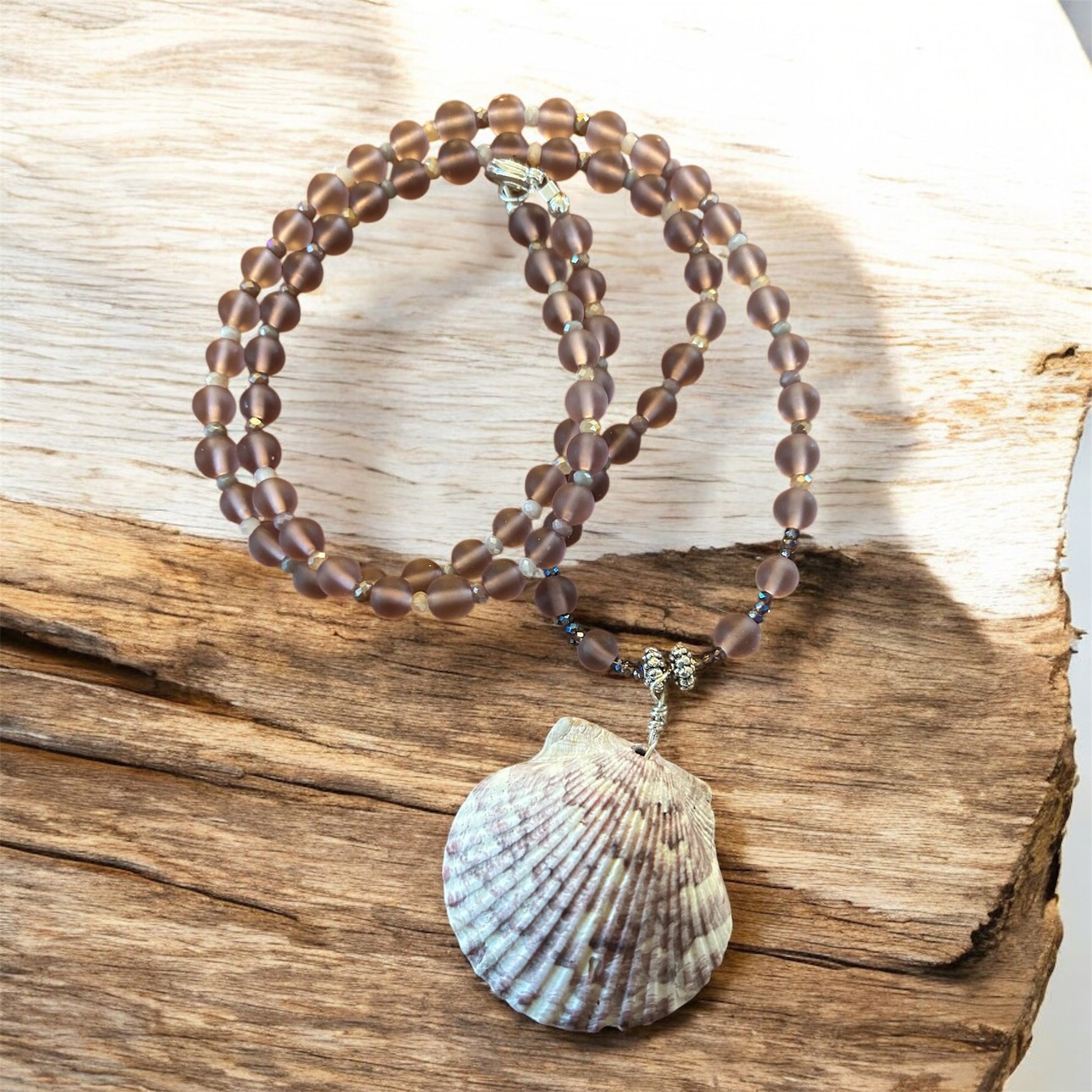 Materials: Calico shells, sea glass beads, silver plated beads