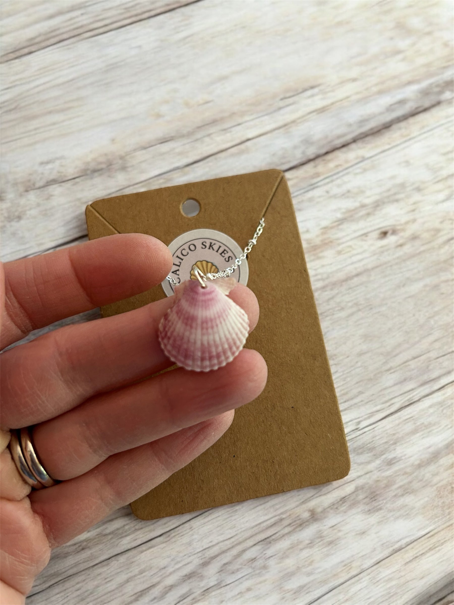 The Purple Haze necklace features a naturally patterned calico shell with soft violet waves and dusky undertones—like sea mist at twilight. Strung on a delicate 16” silver-plated brass chain, it adds a whisper of wanderlust and ocean magic to your everyday style.