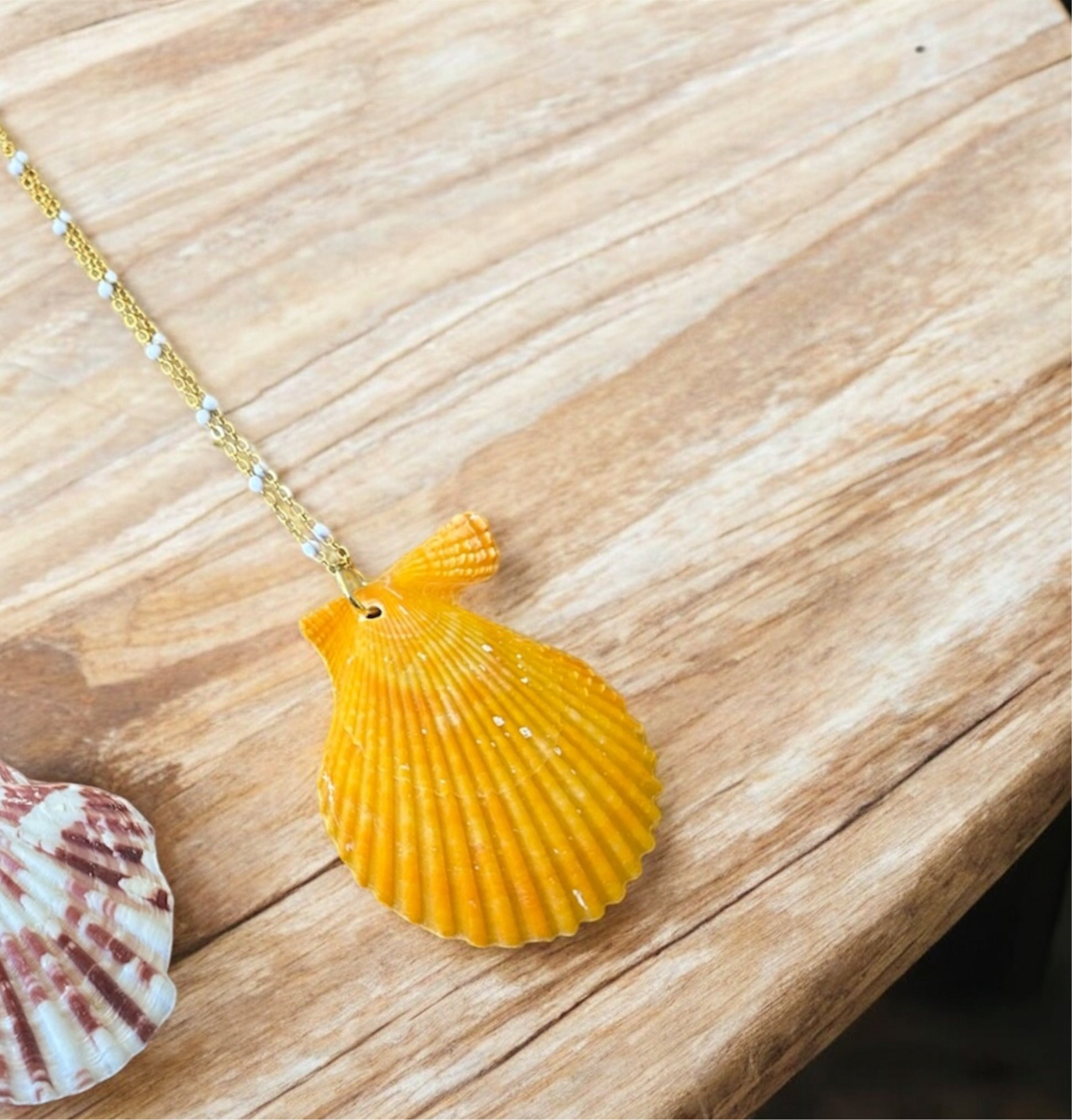 Citrus Cove Scallop Necklace is a handcrafted flat scallop shell suspended on a delicate gold chain. Each shell is unique in color and texture, making every piece as one-of-a-kind.