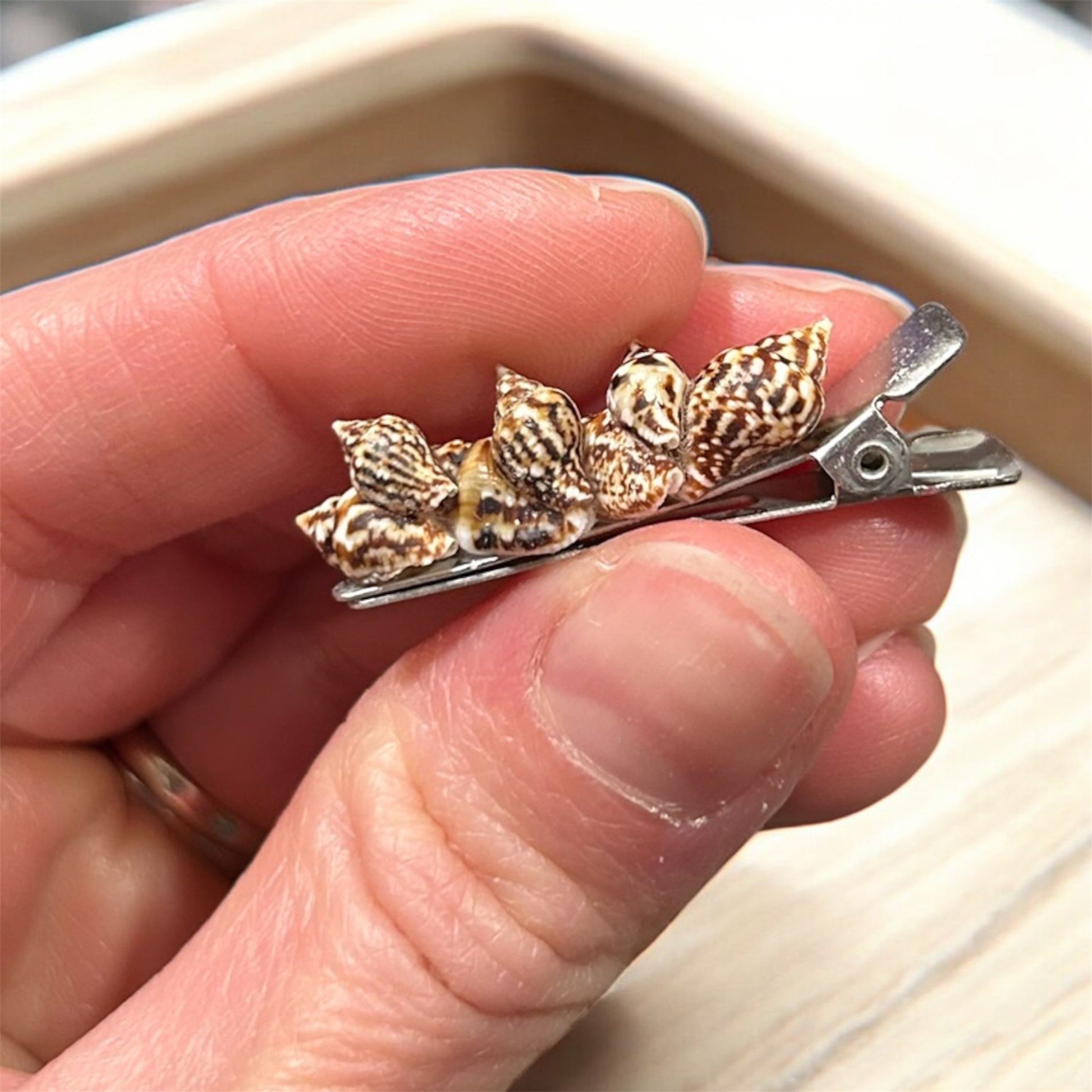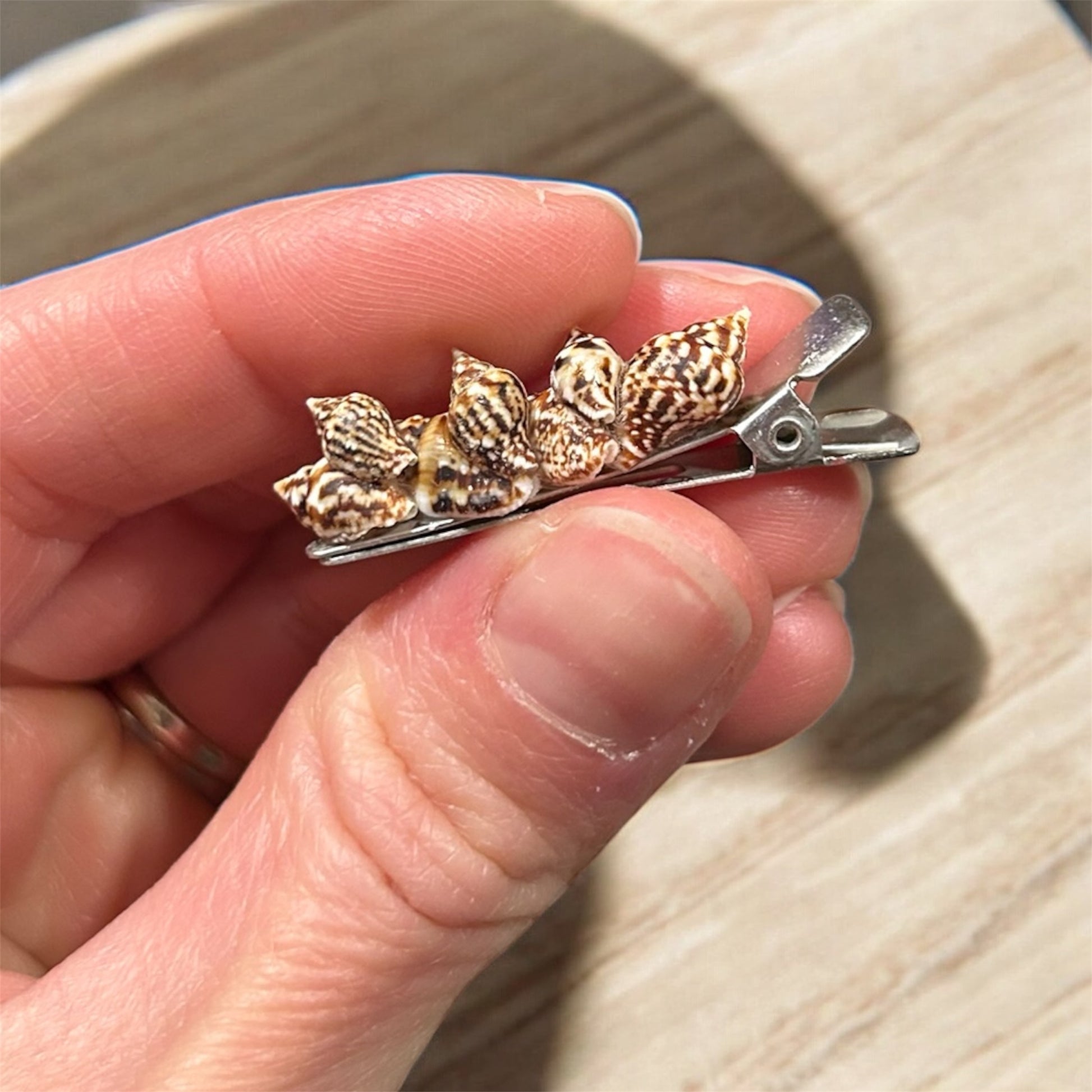 Add a splash of seaside magic to your hairstyle with the Tide Pool Treasure Clip. This coastal-inspired hair accessory features a cluster of real dove shells, each hand-selected for its delicate patterns and natural beauty. Arranged like a tiny tide pool discovery, the shells are set on a sturdy metal alligator clip, perfect for securing loose strands or adding a beachy pop to your look.